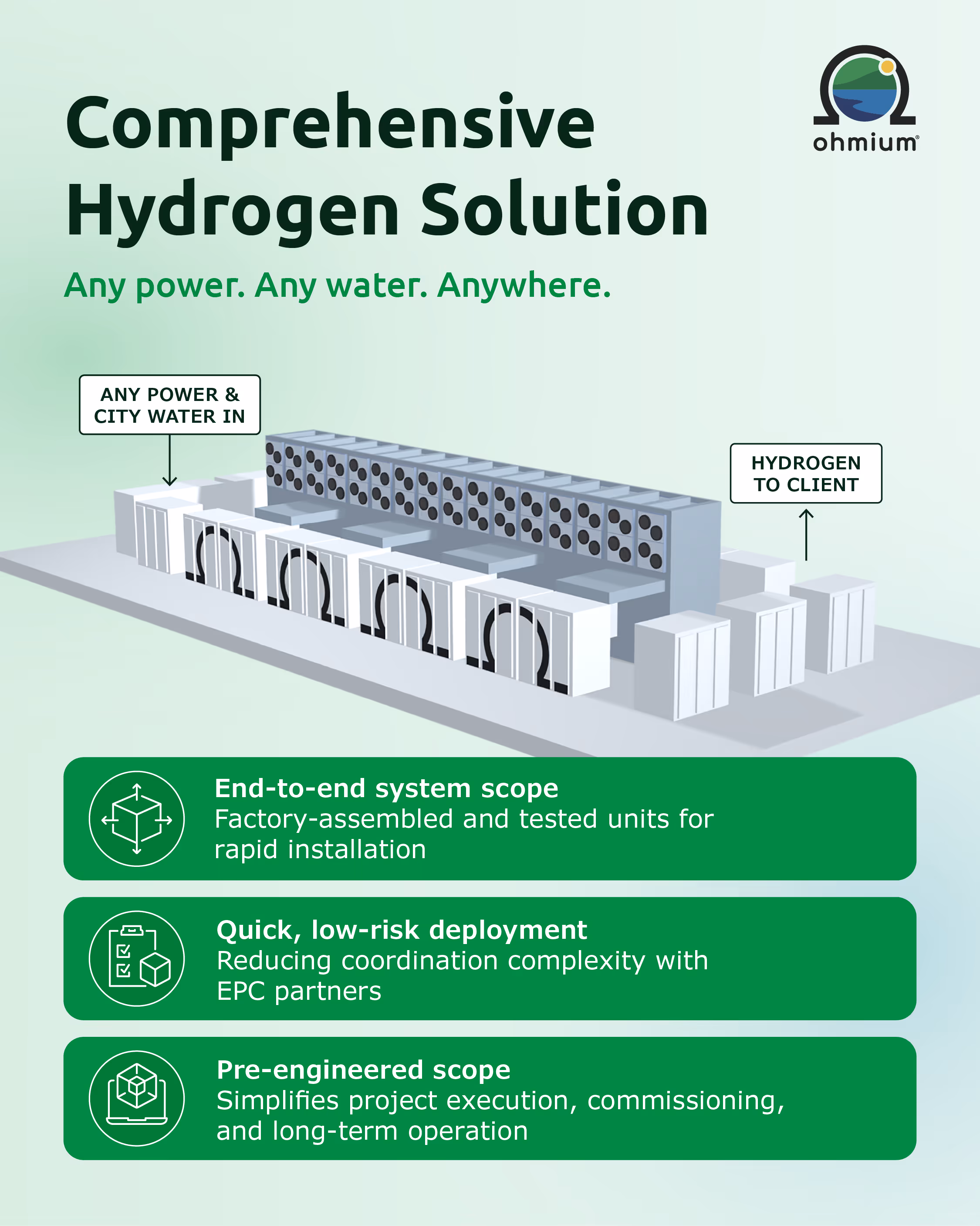In this new series, Ohmium co-founder Arne Ballantine explains the principles and engineering behind the company’s PEM (Proton Exchange Membrane) electrolyzers as comprehensive systems with modular, compact designs built for real-world conditions. These systems handle their own water and power intake without additional modules. They operate in extreme cold and desert heat without protective structures or costly excavations. And their rack-in, rack-out design enables fast maintenance that maintains high plant availability.